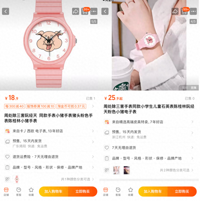 这部电影的热度也体现在了电商平台上,电影仅上映3天,淘宝上的手表商家就感知到了网友们“求链接”的热情,第一时间上架了《周处除三害》同款粉色小猪手表,网友直呼“我就说嘛要相信淘宝速度!”。淘宝上该电影同款手表的搜索量猛增,直接登上了淘宝热搜。