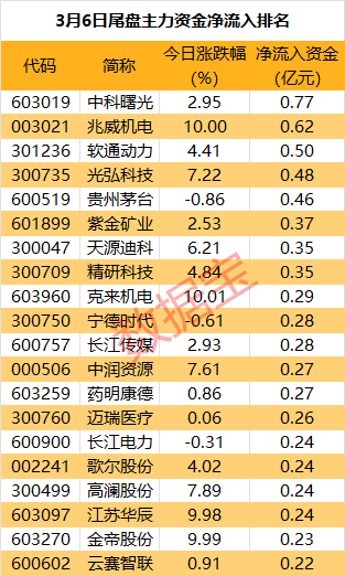 从个股看,5股尾盘主力资金净流入超0.45亿元。中科曙光尾盘获抢筹0.77亿元,居首位。