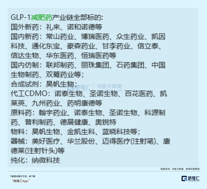 相对来说,以司美格鲁肽为首的国内GLP药产业链,以及GLP创新药公司,可能更受市场关注一点。