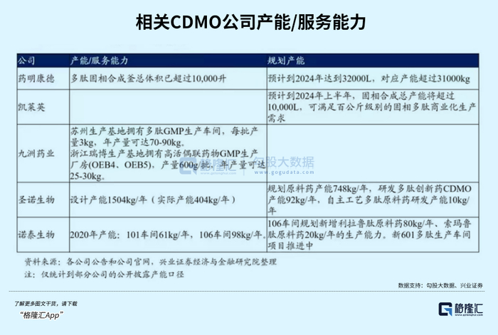 在GLP-1产业链上游方面,2023年全球GLP药物销售额约300亿美元,随着终端产品持续快速放量, 多肽产业链上游原料药和试剂,以及中游CDMO企业有望迎来市场扩容。