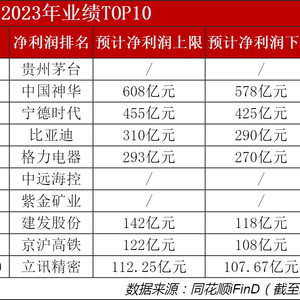 其中,10家公司预计2023年全年净利润(按照预计净利润上限和下限的均值这一指标排序,下同)跨过百亿元门槛。白酒龙头贵州茅台预计2023年全年净利润735亿元,排名第一;中国神华次之,预计全年净利润593亿元;宁德时代预计全年净利润440亿元,暂列第三;第四名、第五名为比亚迪、格力电器,预计全年净利润分别为300亿元、281.5亿元。