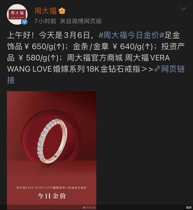 金价一路“飙升”,投资产品的金价也随着上涨。3月6日,周大福的投资产品金价为580元/克,此前3月1日的投资产品金价尚为560元/克,每克金价的上涨幅度高达20元。
