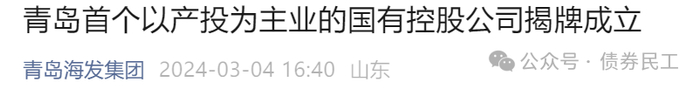 2、2024年3月4日,青岛首个以产投为主业的国有控股公司——青岛海发产业投资控股有限公司揭牌成立。青岛海发产投是以青岛海发控股发展有限公司为主体重组设立,未来将通过战略性重组、专业化整合,逐步划入青岛海发集团持有的产业投资项目股权和园区资产。