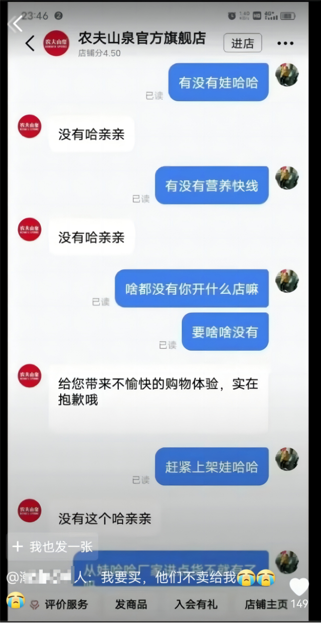 闲来无事的网友也助力一把,他们会去骚扰官方旗舰店,要求官方旗舰店卖娃哈哈的东西,没有怎么办呢?