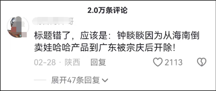 钟睒睒因为从海南倒卖娃哈哈产品到广东被宗庆后开除!