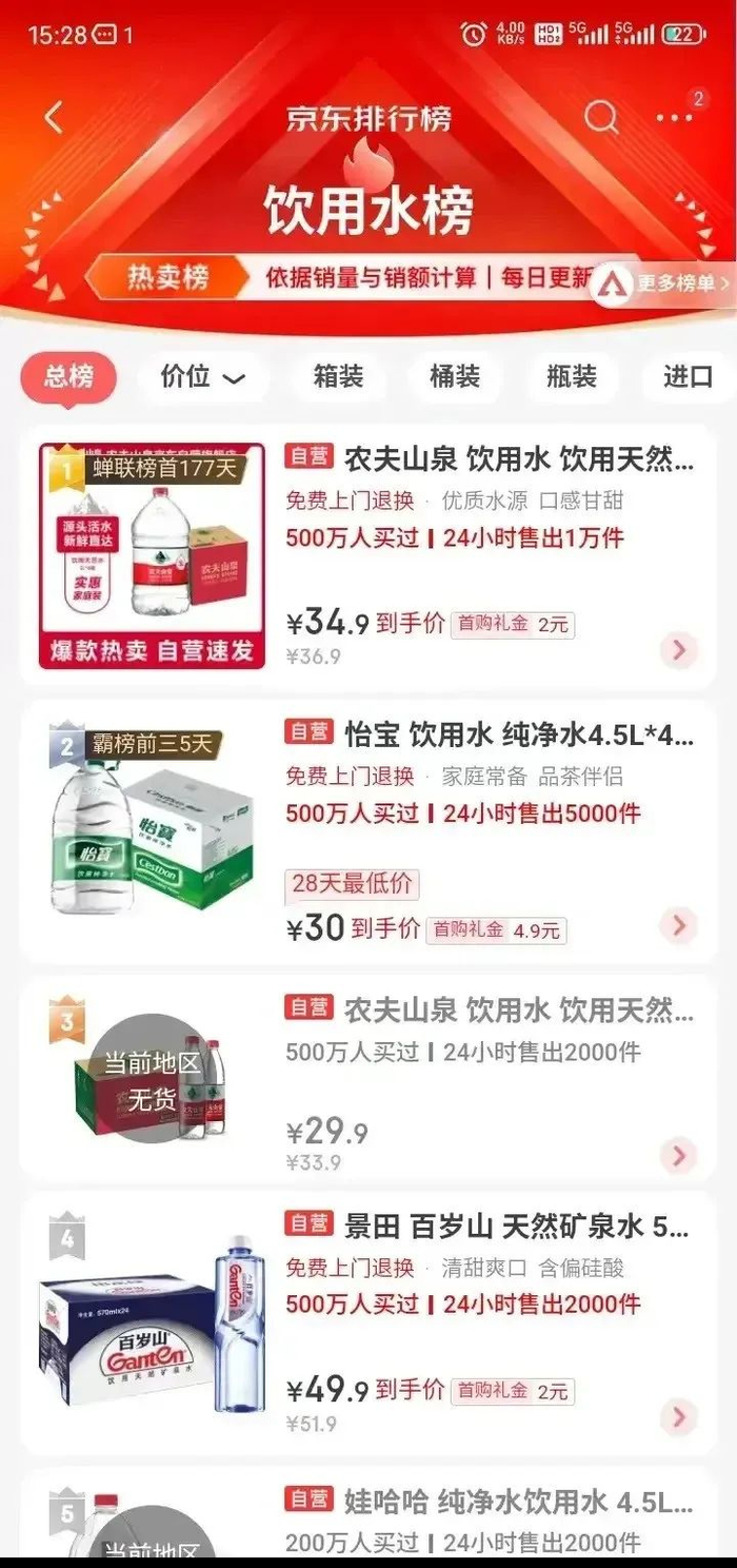 但在京东上面,饮用水排行榜前三名里,农夫山泉占了两个,能对农夫山泉造成一定影响的也还是怡宝。