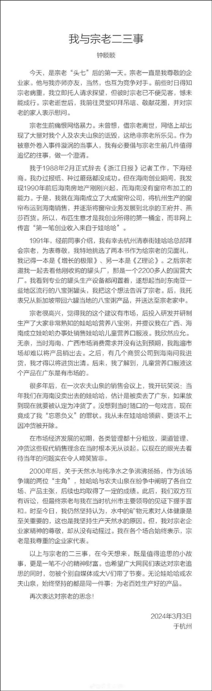 说自己去灵堂叩拜吊唁过,也献了花圈;说布匹生意赚的钱才是自己的第一桶金,和娃哈哈无关;