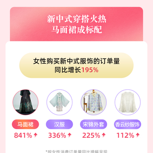 央视龙年春晚节目《年锦》广受好评,四位女性表演者身着汉、唐、宋、明等朝代的中华传统服饰,也迅速激发了消费者的购买热情,为本就走在潮流前端的新中式穿搭再添新火。报告显示,过去一年,女性用户在抖音电商消费新中式服饰的订单量同比提升195%,其中马面裙的订单量同比增长841%,汉服、宋锦外套、香云纱服饰的订单量增速也相当可观,同比增长分别为336%、225%、112%。女性消费对于国潮、非遗的文化传承和市场拓展,起到了重要作用。