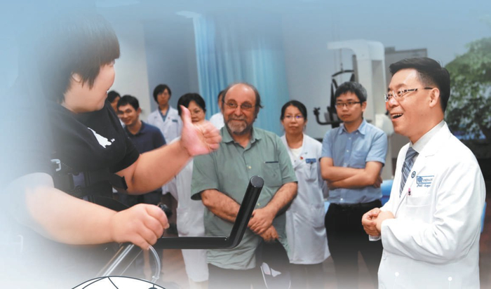 赵国光(右)指导截瘫患者尝试行走