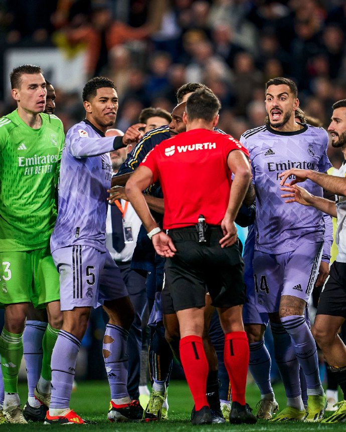 西甲第27轮,皇马客场2比2战平瓦伦西亚,主裁判希尔·曼萨诺在皇马球员传中时吹响了终场哨,导致贝林厄姆绝杀进球无效。