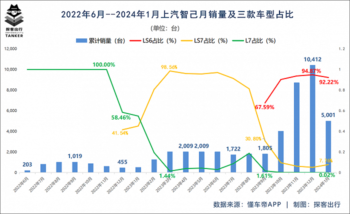 懂车帝数据显示,2024年1月智己汽车品牌单月销量约5001台。其中,智己LS6单车贡献了4612台,占当月总销量的92.22%。智己LS7单月仅卖出了388台,约占当月总销量的7.76%,而智己L7在连续四个月销量低至个位数后,1月销量更是仅卖出了1台新车,占比低至0.02%。