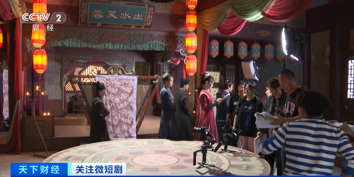 在横店影视城一栋大楼里,一个微短剧剧组正在加紧拍摄,灯光、摄影、滑轨,专业设备就位,讲戏、对词、走位,演员全情投入。