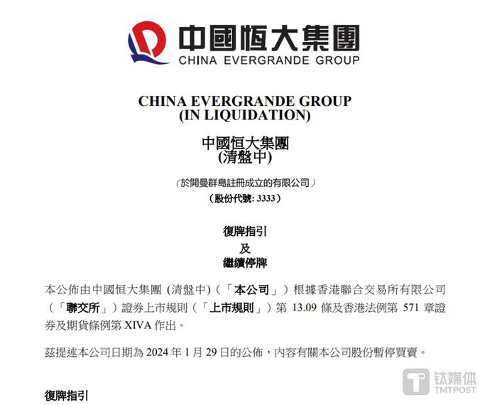 3月6日,中国恒大发布公告称,公司收到港交所日期为2024年2月28日的信函,当中有关恢复买卖公司股份的复牌指引(复牌指引):