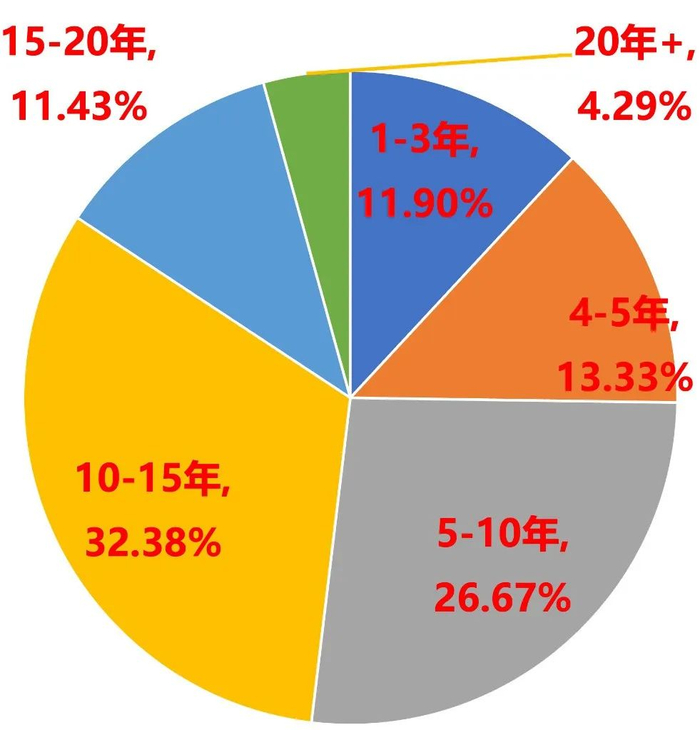 从上面图上可以看到,地产从业10-15年的占比最高,达到32.38%。