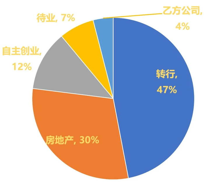 跨行就业中,资产管理公司、互联网平台型企业、新能源行业、保险经纪、考公/进入体制内等是占比较大的几大出路。
