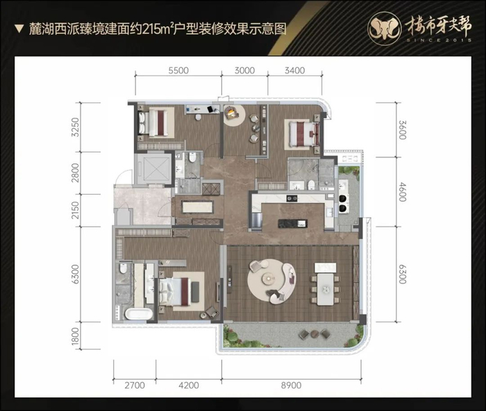 以其建面约215㎡户型为例,270°转角阳台设计的端厅将空间尺度和观景体验直接拉满。