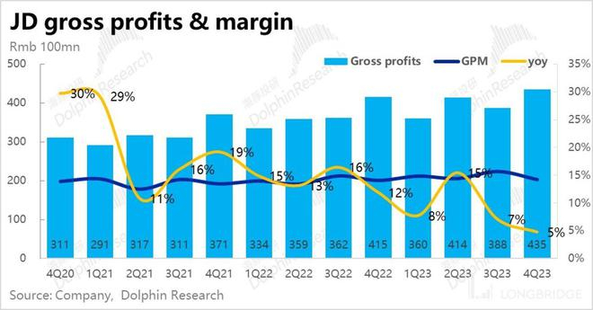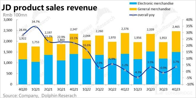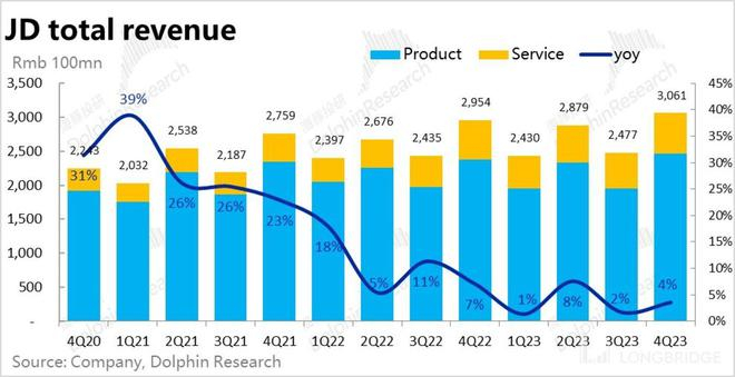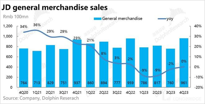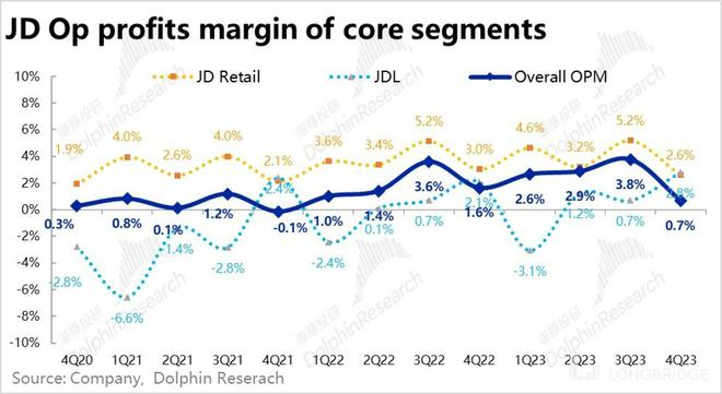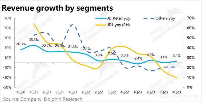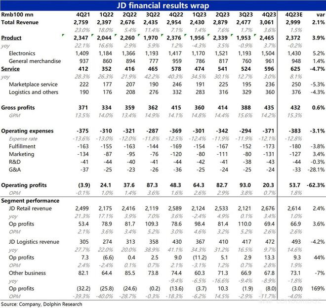 1. 营收低预期下的小 beat,通电商品是首要功臣:本季自营零售业务收入 2654 亿元,同比增长 3.7%,低个位数的绝对增长虽难言强劲,但还是强于公司指引和市场预期的 1%+ 的增速。细分来看,主要是通电商品收入同比增长达 6%,明显好于预期。海豚投研认为百亿补贴等上线后,JD 在优势通电产品上较同行的价差有一定的缩窄,可能夺回了一市场份额。