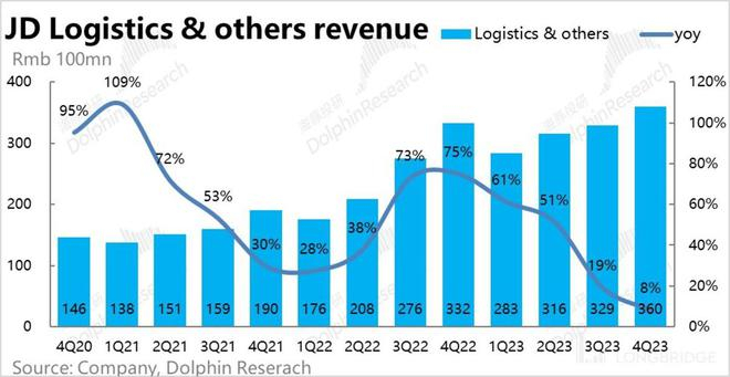 2)京东物流(JDL)本季度的收入为 472 亿,增速放缓到 9.7%,不及市场预期 14.6% 的增速。我们认为免邮门槛下降和放宽 3P 卖家物流供应商是主要诱因