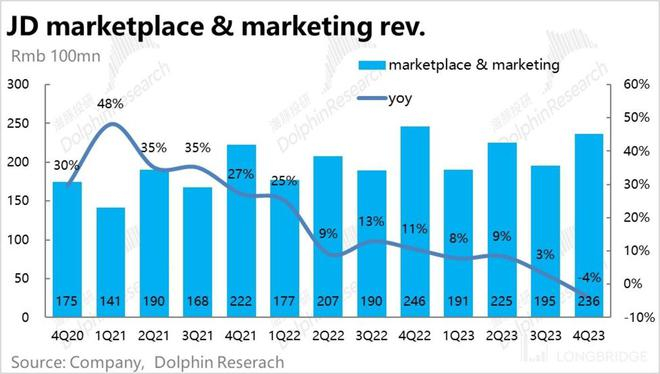 2、平台服务收入:主要面向 3P 卖家的佣金和广告业务本季收入 236 亿元同比反而下降了 3%,低于市场预期 5%。在公司大力发展 3P 卖家生态的情况下,广告佣金收入反而走低有些意外。结合新闻,京东减免商家佣金和服务费以吸引卖家是可能的原因。