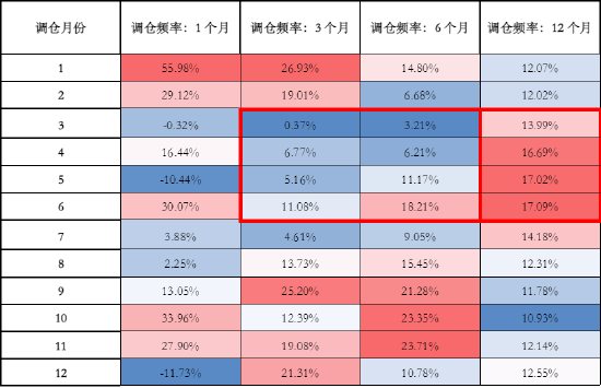 调仓频率为3个月与6个月的最佳调仓时间需要避开每年的3-6月,而按年度调仓的最佳调仓时间却恰好是每年的3-6月(表3)。