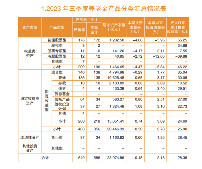 至2023年第三季度,个人养老金投资产品分类及收益情况。图源人力资源社会保障部官网