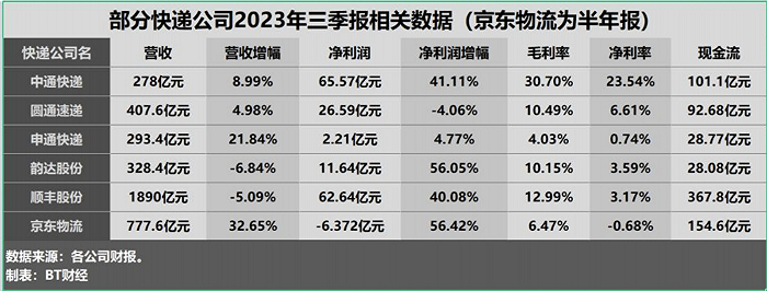 通过财报分析国内大部分的快递企业都是盈利的。2023年前三季度中通快递营收278亿元,同比增长8.99%;归母净利润65.57亿元,同比增长41.11%。期末现金及现金等价物余额为101.1亿元。毛利率为30.70%,净利率为23.54%。