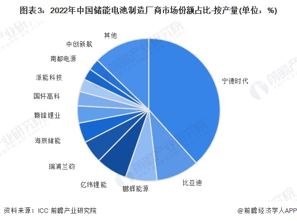 根据ICC披露的数据,2022年,中国储能电池产量为120.31GWh,从市场份额占比来看,宁德时代和比亚迪占比最高,分别约为38.4%和9.7%。鹏辉能源、亿纬锂能和瑞浦兰钧市场份额占比也在5%以上。