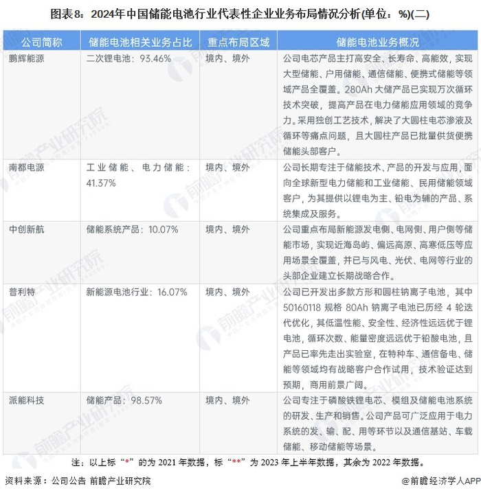 储能电池行业代表性企业大多业务已经出海,代表性企业业务均已涉及境内外。从储能电池相关业务占比来看,派能科技最高,为98.57%。