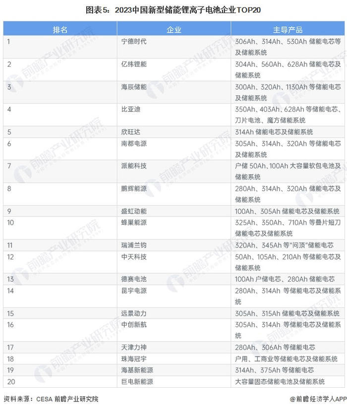 2024年2月,中国化学与物理电源行业协会储能应用分会CESA,从企业经营规模、科研经费投入、知识产权、主营业务出货量、中标规模、产能规模、创新发展、社会责任力等多个维度,评选出“2023中国新型储能锂离子电池企业TOP20”,其中宁德时代、亿纬锂能和海辰储能位列前三。