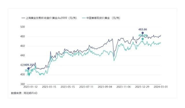 2023年起,金价呈现大幅上涨的趋势。同花顺iFinD数据显示,2023年1月3日至2024年3月1日,上海黄金交易所的Au9999黄金收盘价从412.26元/克上涨到483.40元/克,涨幅约17.256%。按即期汇率换算,在此时间段,香港黄金现货价一直低于上金所Au9999黄金收盘价。二者金价差值最低为1.79元/克,最高为33.11元/克。