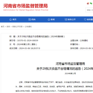 河南省市场监督管理局关于29批次食品不合格情况的通告(2024年第8期)