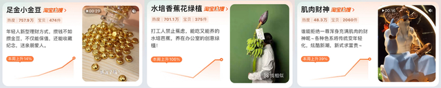 除了投入力量型运动,女性在物质、精神层面的“自我投资”意识,也体现在女性消费的方方面面。如,近几年流行于都市白领中的“攒金豆”风潮,“搞钱女孩”们的投资意识,屡屡把小金豆送上淘宝热搜;而时常登上淘宝热搜的财神爷摆件、“禁止蕉虑”植物周边等,则体现了年轻女性特有的自我疏解之道。