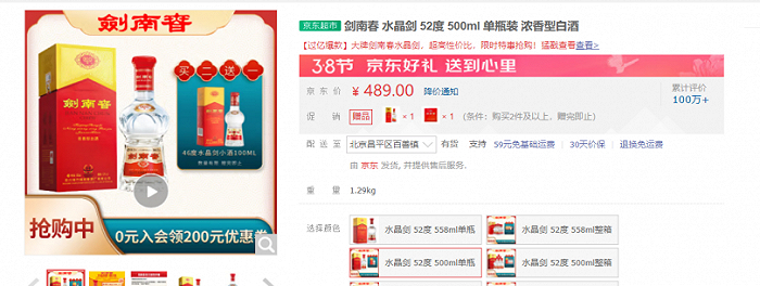 对此,首财君也查阅了京东剑南春官方旗舰店,截至3月6日,剑南春52°水晶剑京东售价为489元,同样低于官方指导价。