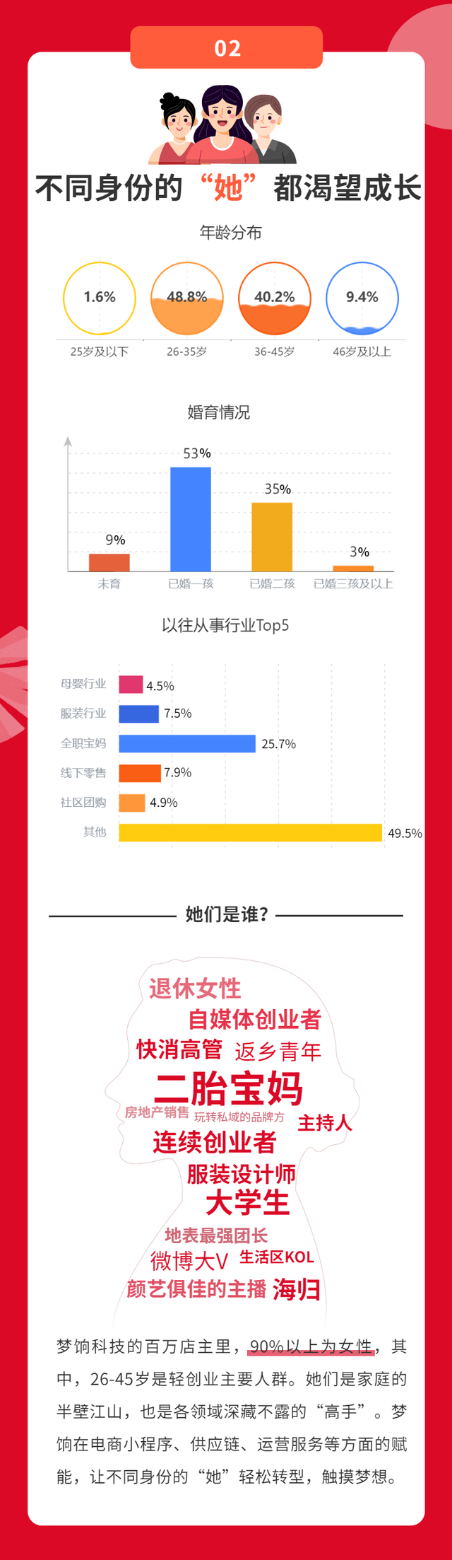 《梦饷科技2024年女性轻创业报告》数据显示,91%的轻创业女性已婚已育,不少人曾在母婴、服装、线下零售、社区团购等各行各业工作,在面临职场和生活的抉择时,她们用时间自由、低门槛的轻创业来作为平衡。在她们之中,有大学生、多胎宝妈、退休女性,任何阶段的女性都热爱折腾、渴望成长,她们追求经济上的独立,也渴望个人成长和社会价值的实现。