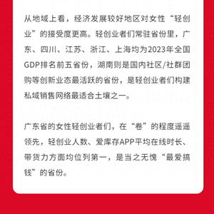 从地域上看,经济发展较好地区对女性“轻创业”的接受度更高,轻创业者们常驻的广东、四川、江苏、浙江、上海均为2023年全国GDP排名前五省份,湖南则是国内社区/社群团购等创新业态最活跃的省份,是轻创业者们构建私域销售网络最适合土壤之一。尤其是广东省的女性轻创业者,她们在轻创业人数、爱库存APP平均在线时长、带货力方面均位列第一,显示出强烈的创业热情和能力。