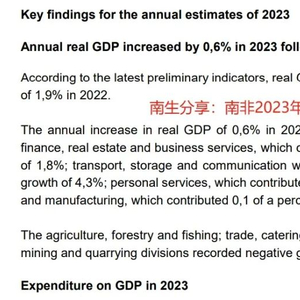 按市场价格计算,南非全社会在2023年完成的名义GDP为69701.63亿兰特,剔除物价变动因素实际上涨0.6%。这是按本币计算的,参与国际对比通常要换算成美元。当然也可是人民币、欧元……