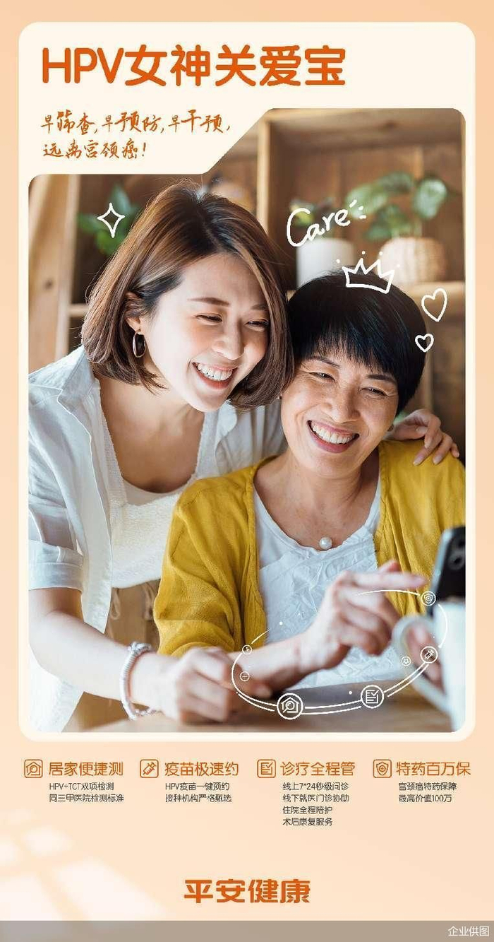 关注女性健康,从科学预防宫颈癌开始。平安健康推出HPV女神关爱宝,正是希望通过创新HPV全病程管理模式,以全面的早筛服务和专业的诊疗保障,帮助广大女性完成居家自助HPV检测,及早发现潜在健康问题,实现早筛查、早预防、早干预、早治疗,提升宫颈疾病治愈率,降低宫颈癌发生率,为女性创造一个更加健康美好的未来。