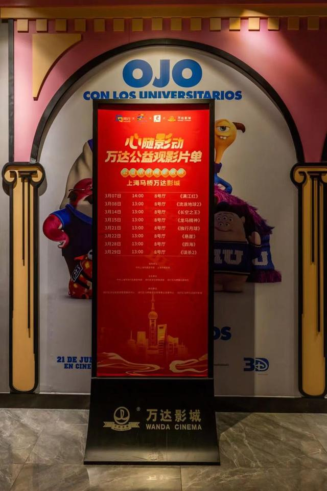 目前,马桥万达国际影城8号影厅每周一至周五的非黄金时间段实行“固定+专场”公益电影排片模式,主管部门量身定制了“心随影动”公益农村电影进影院四大主题片单,预计全年放映96场,3月放映的影片包括《满江红》《流浪地球2》《长空之王》等。