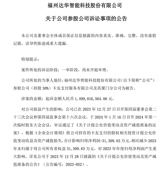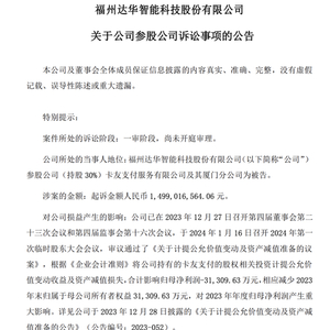据了解,2023年10月底,达华智能发布卡友支付涉诉的公告,称华夏银行厦门分行起诉卡友支付、卡友厦门和上官步燕,索赔金额与此次金额相同。随后在2023年2月18日,达华智能公告称华夏银行厦门分行撤诉。相较于上次诉讼,本次诉讼的被告方新增了王红雨。