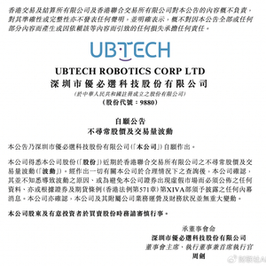 由于昨日股价接近翻倍之后,今日早盘持续飙涨62%,优必选在港交所发布公告,称公司股份近期于香港联合交易所有限公司出现不寻常股价及交易量波动。作出一切有关公司于合理情况下之查询后,确认并不知悉导致波动之原因。还确认公司及其附属公司业务运营及财务状况并无重大变动。提醒公司股东及有意投资者买卖股份时请审慎行事。