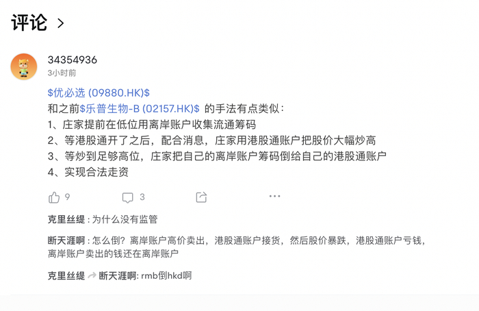 此外,市场传出优必选的情况和之前乐普生物-B类似,都是庄家提前在低位用离岸账户收集筹码,等港股通开通,配合消息,庄家用港股通账户把股价大幅炒高。由于半新股未解禁,加上流通筹码已经提前被庄家收集,股价很容易炒高。等炒到足够高位,庄家把自己离岸账户筹码倒给自己港股通账户,实现合法走资。