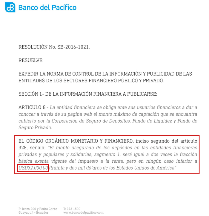 〓厄瓜多尔国有银行太平洋银行官网上有关存款保险范围的说明