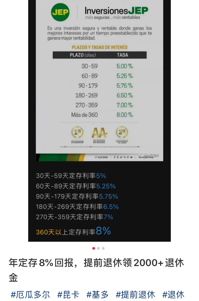譬如,厄瓜多尔规模最大、信誉最高的信用合作社JEP,2年定存利率可高达8.5%,故而最早为中国客户所认可。