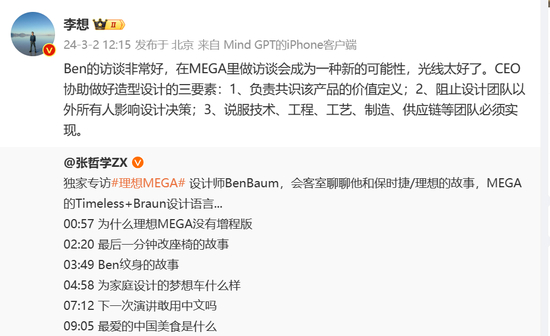 今年3月2日,李想还转发了Ben Baum的专访,称CEO协助做好造型设计的三要素:1、负责共识该产品的价值定义;2、阻止设计团队以外所有人影响设计决策;3、说服技术、工程、工艺、制造、供应链等团队必须实现。