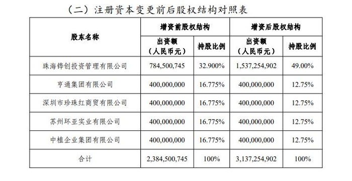 由于只有珠海铧创参与本次增资,增资完成后,其他4家股东的持股比例将被稀释。其中,珠海铧创的持股比例由32.9%上升至49%,亨通集团、深圳市珍珠红商贸有限公司、苏州环亚实业有限公司、中植企业集团的持股比例均由16.775%降至12.75%。