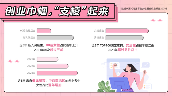 全国妇联的数据显示,女性是“双创”的重要力量,互联网领域创业者中女性占55%。淘宝平台的女性创业者比例逐年提高,2023年00后女性创业者首次超过三成,且更多来自三四线和西部地区。在淘宝主播和“云客服”中,女性占比高达80%和85%,为“宝妈”和大学生提供了大量就业机会。