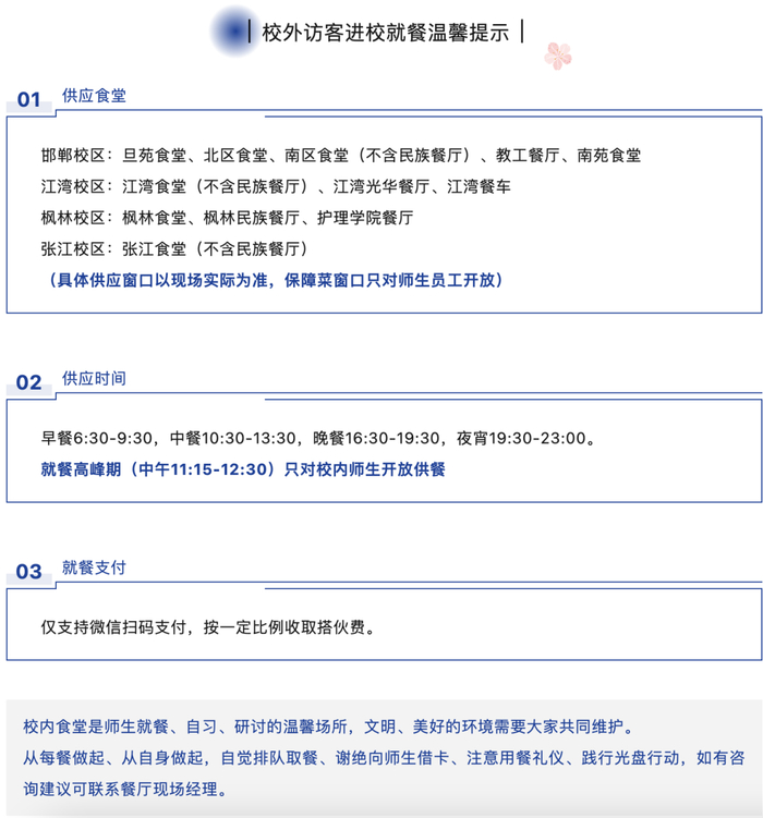 就餐高峰期(中午11:15-12:30)只对校内师生开放供餐