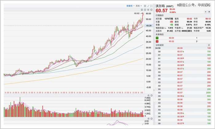 2020年初到今年3月初,美国沃尔玛的股价从35美元左右升至60美元左右并创历史新高,开市客(Costco)则更猛,股价从250美元左右飙升到超过770美元同样创历史新高。
