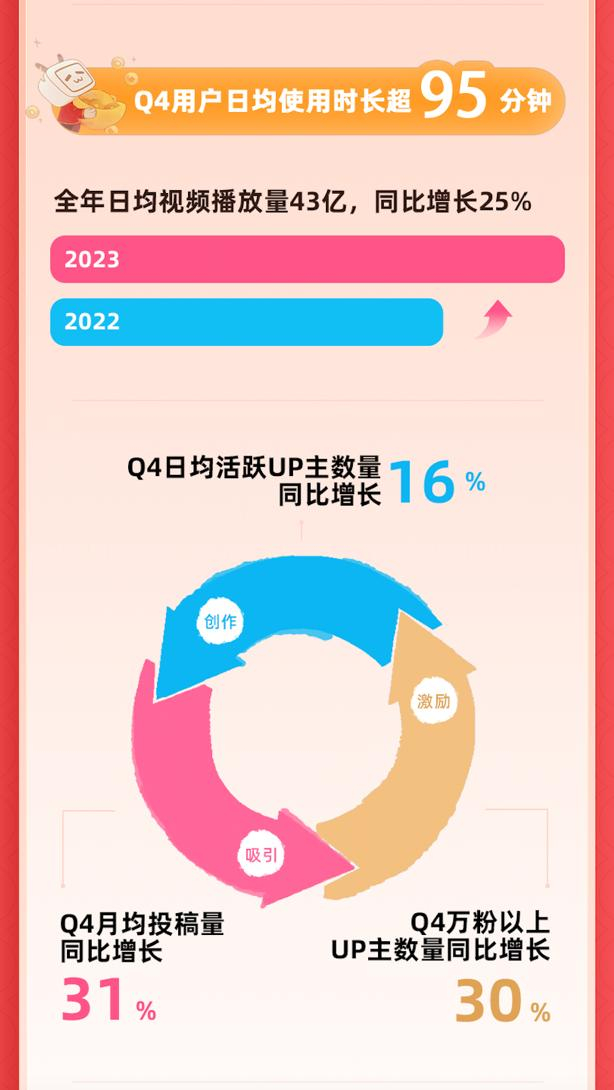 第四季度,B站月均互动数超140亿次,用户日均使用时长稳定在95分钟,全年日均视频播放量达43亿,同比增长25%。截至2023年底,2.3亿用户通过了入站考试,成为B站“正式会员”,正式会员的第12个月留存率稳定在80%左右。