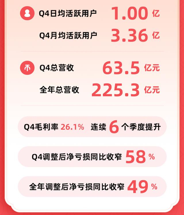 2023年,B站在保证用户高质量增长的同时,持续提升运营效率,将优质流量转化为商业收入。第四季度,B站日均活跃用户超1亿,月均活跃用户3.36亿,日均使用时长超95分钟。随着商业化能力和运营效率不断提升,四季度,广告收入同比增长28%,毛利率连续6个季度环比提升至26.1%,调整后净亏损同比大幅收窄58%。第四季度经营现金净流入6.4亿元人民币,并实现了全年正向经营现金流。